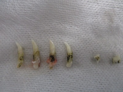 通常、歯周炎や歯根炎は、奥歯が多いのですが、この子は犬歯に病変が見られました。犬歯は、歯茎から出ている部分より、埋まっている部分の方が長いので、抜くのはなかなか大変ですが、今日のニャンコは、骨にも病変が広がっているようで、それほど苦労なく抜歯できました。