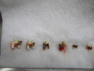 今日来院して来たときには、よだれは治まっていました。歯肉炎で奥の歯はグラグラしていましたから、それほど苦労することもなく抜歯出来ました。抜いた後の歯肉は、止血と傷の回復を兼ねて縫合してました。よだれは、注射が効きましたが、薬の効力がなくなると、また再発すると思われ、今日の処置が、完治につながるでしょう。まだ、若い猫ですからね。